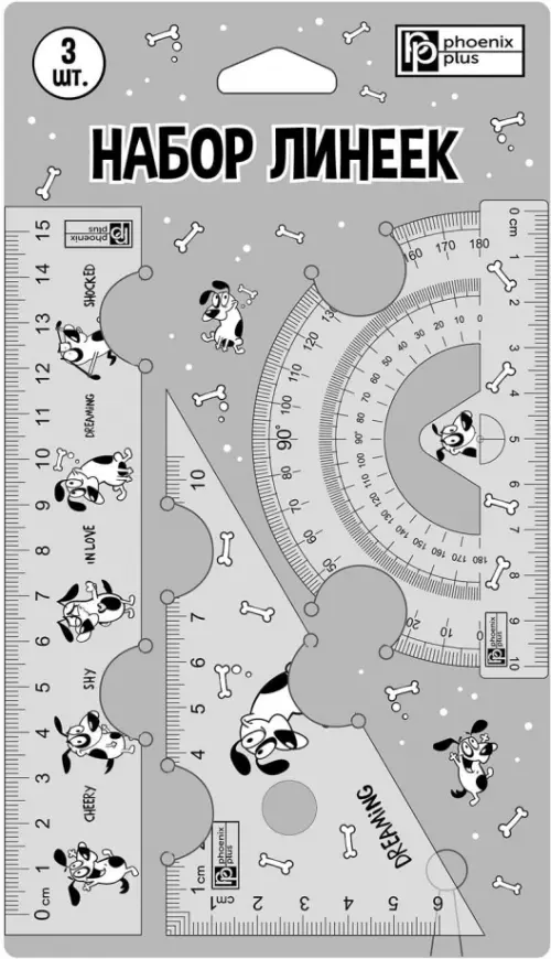 Набор линеек, 16х3 см (линейка); 12х7 см (треугольник); 10,5х5,6 см (транспортир), полиэтилентерефталат, шелкография в две краски, подложка из мелованного картона + ПЭТ-пакет с европодвесом.