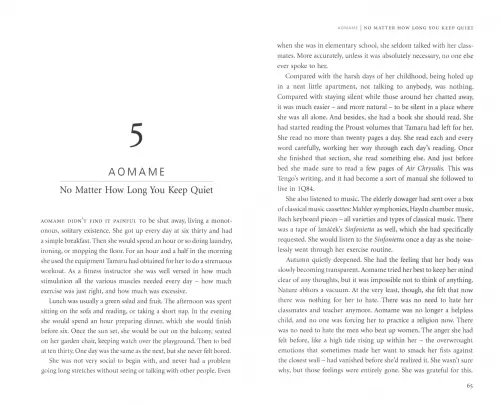 But things are moving forward, and Aomame does not yet know that she and Tengo are more closely bound than ever.
