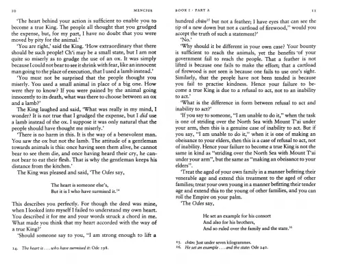 Удивительно современные взгляды Мэн-цзы на обязанности подданных и правителей, а также на зло войны сформировали конфуцианскую ортодоксию, которая остается нетронутой с III века до нашей эры.