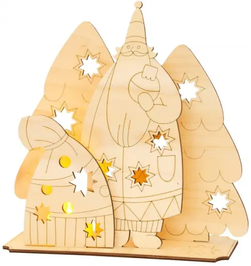 Интерьерное украшение с подсветкой к Новому году и Рождеству Христову. Композиция состоит из нескольких деталей, которые крепятся на подставке, и светодиодной свечи. Сборную модель можно раскрасить по вашему желанию. Подойдет для творческих занятий, для семейного творчества и досуга. Развивает пространственное мышление, мелкую моторику, усидчивость, терпение. Хороший подарок к любимым зимним праздникам!