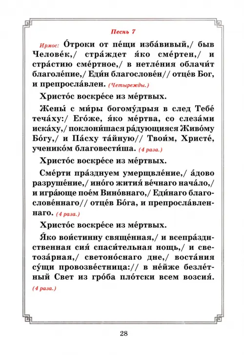В книге содержится последование Пасхального богослужения: полунощница, утреня, часы, Литургия, вечерня в день Пасхи.