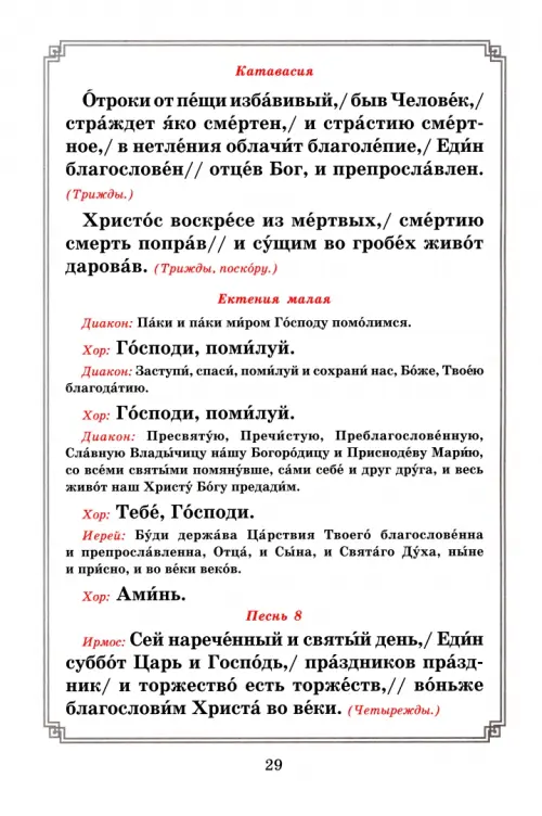 Неизменяемые нотные песнопения и текст чтеца набраны средним шрифтом, а изменяемые песнопения — укрупненным, с ударениями и разметкой для пения.