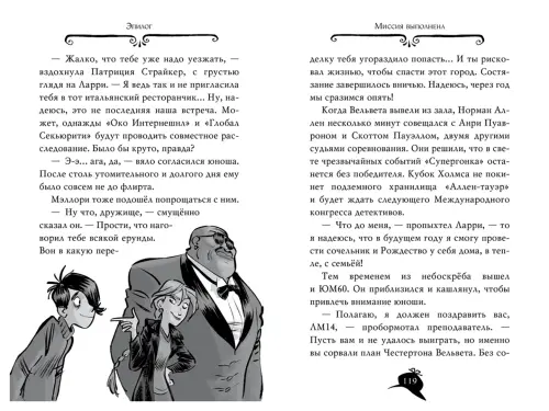 Ларри готовится отпраздновать Рождество по-домашнему, в кругу семьи. Но не тут-то было: неожиданно он получает указание спешить в Нью-Йорк на престижный Международный конгресс детективов и принять участие в "Супергонке". Юноше предстоит сразиться за Кубок Холмса со своими сверстниками из ведущих детективных школ мира. Ларри, Агата, мистер Кент и кот Ватсон вылетают в Нью-Йорк, где к их команде присоединяется очередной Мистери - дядя Ким, городской альпинист. Казалось бы, можно на время забыть о преступниках, ведь в этом состязании сыщик играет против сыщика. Однако организаторам и участникам соревнования невдомёк, что в этом году "Супергонка" станет прикрытием для преступления века…