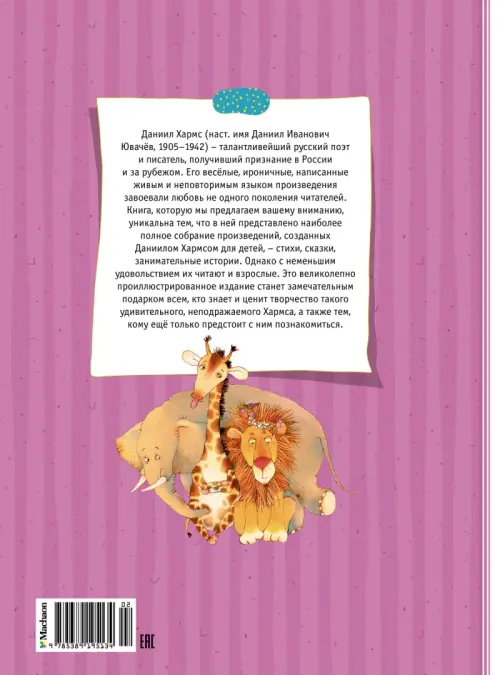 Книга, которую мы предлагаем вашему вниманию, уникальна тем, что в ней представлено наиболее полное собрание произведений, созданных Даниилом Хармсом для детей, – стихи, сказки, занимательные истории. Однако с неменьшим удовольствием их читают и взрослые. Это великолепно проиллюстрированное издание станет замечательным подарком всем, кто знает и ценит творчество такого удивительного, неподражаемого Хармса, а также тем, кому ещё только предстоит с ним познакомиться.