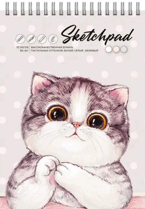 Скетчпад А5 145х210 мм, 40 л, блок - белый офсет, серый офсет, бежевый офсет 80 г/м?, арт. 62769 МИЛАЯ КОШКА /обложка полноцветная печать, твёрдый переплёт, гребень по короткой стороне, матовая ламинация,