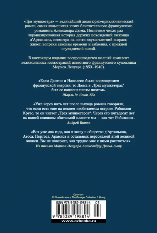 «Три мушкетера» — величайший авантюрно-приключенческий роман, самая знаменитая книга блистательного французского романиста Александра Дюма. Несчетное число раз экранизированная история дерзких похождений гасконца д’Артаньяна, несмотря на почти двухсотлетний возраст, живет, вопреки законам времени и забвения, с прежней неувядаемой силой.
