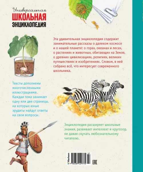 Эта удивительная энциклопедия содержит занимательные рассказы о далеком космосе и о нашей планете: о горах, океанах и лесах, о растениях и животных, обитающих на Земле, о древних цивилизациях, религиях, великих путешествиях и изобретениях. Словом, в ней собрано всё, что интересует современного школьника. Тексты дополнены многочисленными иллюстрациями. Каждая тема занимает одну или две страницы, на которых юные эрудиты найдут ответы на свои вопросы. Энциклопедия расширяет школьные знания, развивает интеллект и кругозор, не давая скучать любознательному читателю.