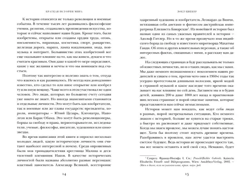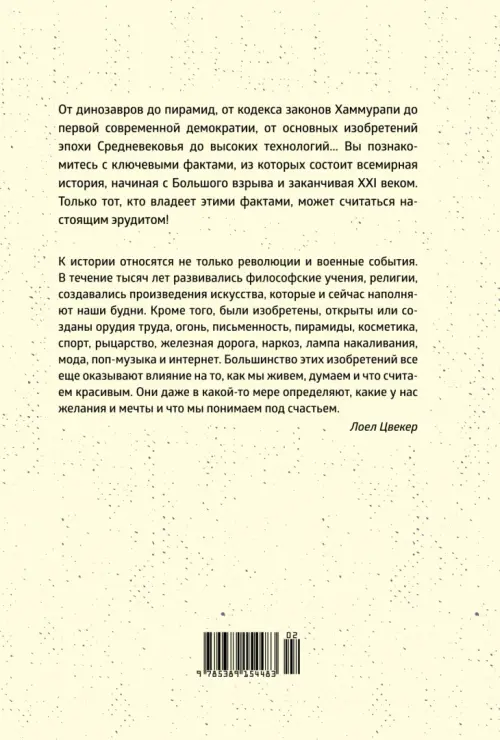 «Я расскажу вам всемирную историю, начиная с образования нашей планеты около 4,6 миллиарда лет назад и заканчивая XXI веком. В этом путешествии во времени мы посетим древность, Средневековье и Новое время вплоть до сегодняшнего дня. Надеюсь, мне удалось сохранить основные взаимосвязи и представить их в наиболее наглядном виде». (Лоел Цвекер)