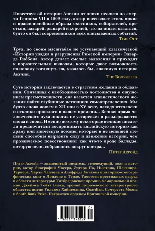 В этой книге показана история Англии от периода неолита, первых поселений и постройки Стоунхенджа до возведения средневековых соборов, формирования всеобщего права и конца правления первого короля династии Тюдоров Генриха VII. Повествование ведется о последовательных волнах захватчиков — римлян, викингов, саксов и норманнов, о воюющих королях, о междоусобицах внутри страны и о чужеземных войнах. В труде Акройда, которого по праву считают одним из лучших английских литераторов, воссоздается не только политическая история, будни королевских особ и перипетии их взаимоотношений, но и повседневная жизнь простых людей с ее традициями, обычаями и материальной культурой. Солидный историко-литературный труд, снабженный 51 цветной иллюстрацией, представит интерес для широкого круга читателей.
