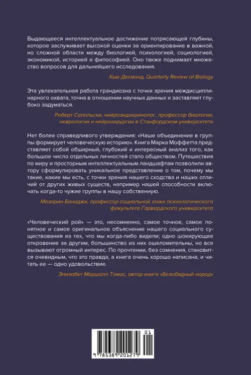 «Эта книга посвящена захватывающей и важной для любого человека теме — осознанию себя как части общества и рассмотрению самого феномена общества под лупой эволюционных процессов в животном мире. Марк Моффетт сравнивает человеческое общество с социальными образованиями общественных насекомых, и эти сравнения вполне уместны. И его последующий интерес к устройству социальных систем у широкого круга позвоночных, от рыб до человекообразных обезьян, не случаен. Как эволюциониста, его интересы связаны с выявлением причин и факторов, влияющих на трансформации социального поведения у разных таксонов, роли экологии в усложнении общественных связей, с поиском связей между морфологическими и психологическими преобразованиями, в конечном итоге приведших к возникновению нашего вида. Человека разумного, уникального в своем развитии речи, культуры, техники и искусства. Уникального в стремлении к познанию тайн бескрайней вселенной… Но продолжающего оставаться беззащитным в мире конфликтов и насилия, порожденном им же самим». (М. Л. Бутовская)