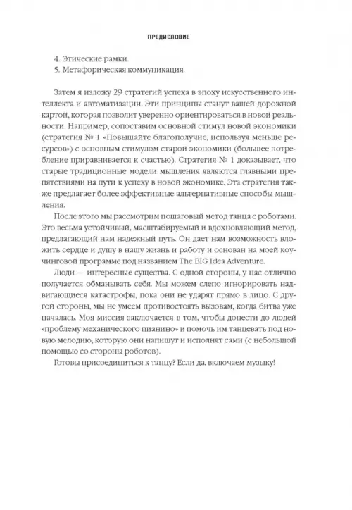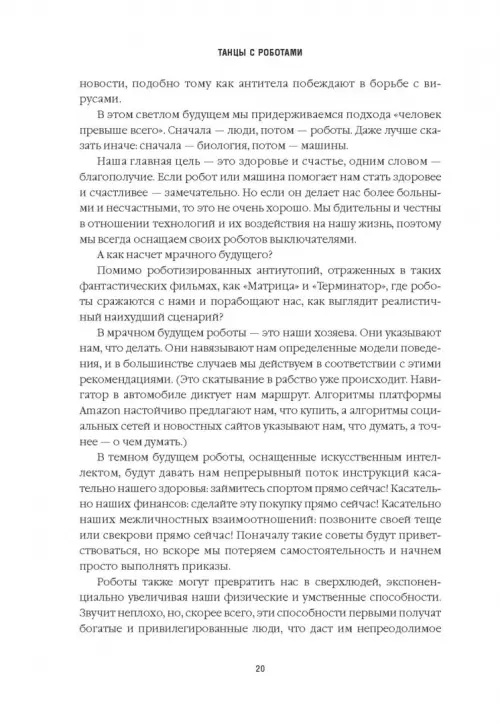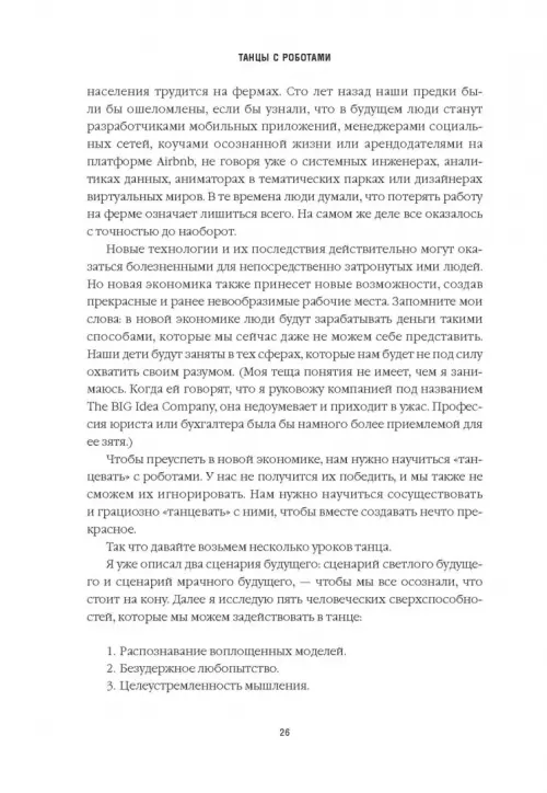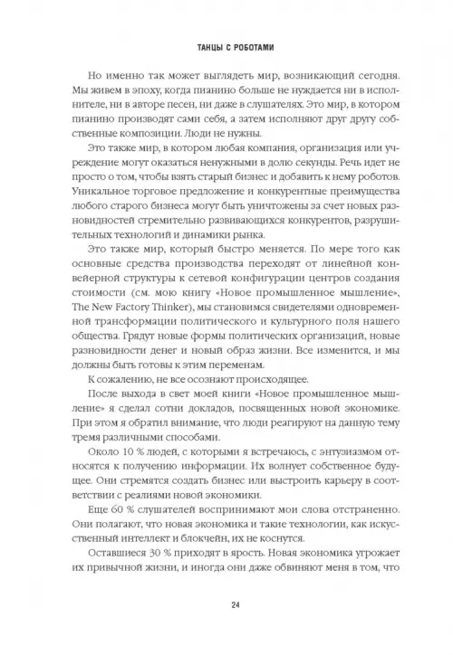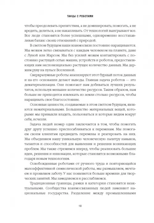 Искусственный интеллект, машинное обучение, алгоритмы, блокчейн, интернет вещей, аналитика больших данных, сети 5G, беспилотные автомобили, робототехника, 3D-печать. В ближайшие годы эти и другие технологии окажут огромное, буквально революционное влияние на то, как мы работаем и живем. Хотим мы этого или нет, но нам необходимо выстроить хорошие рабочие отношения с этими технологиями. Мы должны уметь "танцевать" с роботами.