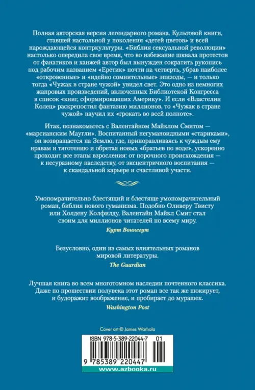 Полная авторская версия легендарного романа. Культовой книги, ставшей настольной у поколения «детей цветов» и всей нарождающейся контркультуры. «Библия сексуальной революции» настолько опередила свое время, что во избежание шквала протестов от фанатиков и ханжей автор был вынужден сократить рукопись под рабочим названием «Еретик» почти на четверть, убрав наиболее «откровенные» и «идейно сомнительные» эпизоды, — и только тогда «Чужак в стране чужой» увидел свет. Это одно из немногих жанровых произведений, включенных Библиотекой Конгресса в список «книг, сформировавших Америку». И если «Властелин Колец» раскрепостил фантазию миллионов, то «Чужак в стране чужой» научил их «грокать во всей полноте». Итак, познакомьтесь с Валентайном Майклом Смитом — «марсианским Маугли». Воспитанный негуманоидными «стариками», он возвращается на Землю, где, приноравливаясь к чуждым ему нравам и тяготению и обретая новых «братьев по воде», ускоренно проходит все этапы взросления: от порочного происхождения — к несуразному наследству, от эксцентричного воспитания — к скандальной карьере и счастливой участи. «Умопомрачительно блестящий и блестяще умопомрачительный роман, библия нового гуманизма. Подобно Оливеру Твисту или Холдену Колфилду, Валентайн Майкл Смит стал своим для миллионов читателей по всему миру» (Курт Воннегут).