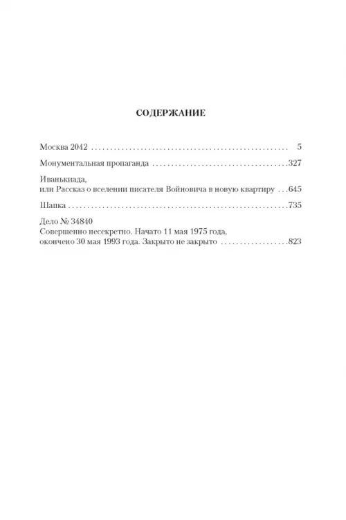 В сборник, помимо романа-антиутопии «Москва 2042», вошли произведения «Монументальная пропаганда», «Иванькиада», «Шапка» и «Дело № 34840».
