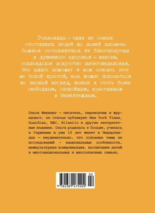 Если вы обнаружили ошибку в описании товара «Niksen. Голландское искусство ничегонеделания» (авторы: Меккинг Ольга), то выделите её мышкой и нажмите Ctrl+Enter. Спасибо, что помогаете нам стать лучше!