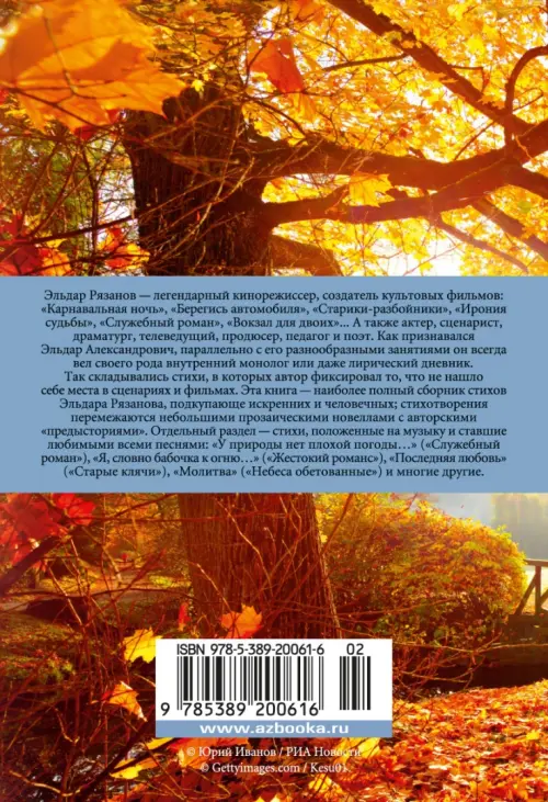 Эльдар Рязанов – легендарный кинорежиссер, создатель культовых фильмов: «Карнавальная ночь», «Берегись автомобиля», «Старики-разбойники», «Ирония судьбы», «Служебный роман», «Вокзал для двоих»... А также актер, сценарист, драматург, телеведущий, продюсер, педагог и поэт! Как признавался Эльдар Александрович, параллельно с его разнообразными занятиями он всегда вел своего рода внутренний монолог или даже лирический дневник. Так складывались стихи, в которых автор фиксировал то, что не нашло себе место в сценариях и фильмах. Эта книга – наиболее полный сборник стихов Эльдара Рязанова, подкупающе искренних и человечных; стихотворения перемежаются небольшими прозаическими новеллами с авторскими «предысториями». Отдельный раздел – стихи, положенные на музыку и ставшие любимыми всеми песнями: «У природы нет плохой погоды…» («Служебный роман»), «Я, словно бабочка к огню…» («Жестокий романс»), «Последняя любовь» («Старые клячи»), «Молитва» («Небеса обетованные») и многие другие.