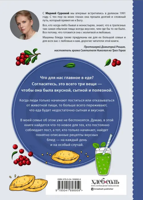Во время поста люди нередко ограничивают себя в некоторых действиях, в том числе и в еде, отказываясь на этот период от мяса, молочных продуктов и сладких изделий. Но кто сказал, что постные блюда не могут быть сытными, а главное - вкусными? В своей новое книге Мария Сурова, телеведущая в программе "Доброе утро" на Первом канале, собрала для вас более 100 разнообразных и питательных рецептов на любой вкус. Салаты, горячее, супы, закуски и даже выпечка - и все это можно есть в пост и каждый день! Радуйте себя и своих близких вкусными домашними блюдами, насыщайтесь физически и духовно.