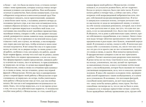 Роман "Бетон" был написан Томасом Бернхардом в 1982 году на одном дыхании: как и рассказчик, автор начинает работу над рукописью зимой в Австрии и завершает весной в Пальма-де-Майорке. Рассыпав по тексту прозрачные автобиографические намеки, выставив напоказ одни страхи (животный страх задохнуться, замерзнуть, страх чистого листа) и затушевав другие (бедность, близость), он превратил исповедь больного саркоидозом героя в поистине барочный фарс, в котором смерть и меланхолия сближаются в последней пляске. Можно читать этот безостановочный нарциссический спич как признания на кушетке психоаналитика, как типично австрийскую логико-философскую монодраму, семейный роман невротиков или буржуазную историю гибели одного семейства, главной темой всё равно остается музыка. Книга о невозможности написать книгу о композиторе Мендельсоне - музыкальное приношение Бернхарда модернизму, ставящее его в один ряд с мастерами "невыразимого" Беккетом, Пессоа, Целаном, Бахман.