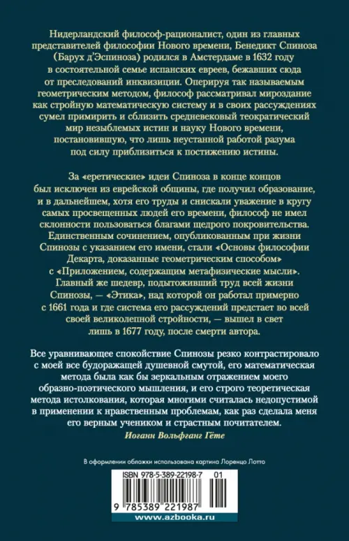 Нидерландский философ-рационалист, один из главных представителей философии Нового времени, Бенедикт Спиноза (Барух д'Эспиноза) родился в Амстердаме в 1632 году в состоятельной семье испанских евреев, бежавших сюда от преследований инквизиции. Оперируя так называемым геометрическим методом, философ рассматривал мироздание как стройную математическую систему и в своих рассуждениях сумел примирить и сблизить средневековый теократический мир незыблемых истин и науку Нового времени, постановившую, что лишь неустанной работой разума под силу приблизиться к постижению истины. За "еретические" идеи Спиноза в конце концов был исключен из еврейской общины, где получил образование, и в дальнейшем, хотя его труды и снискали уважение в кругу самых просвещенных людей его времени, философ не имел склонности пользоваться благами щедрого покровительства. Единственным сочинением, опубликованным при жизни Спинозы с указанием его имени, стали "Основы философии Декарта, доказанные геометрическим способом" с "Приложением, содержащим метафизические мысли". Главный же шедевр, подытоживший труд всей жизни Спинозы, - "Этика", над которой он работал примерно с 1661 года и где система его рассуждений предстает во всей своей великолепной стройности, - вышел в свет лишь в 1677 году, после смерти автора.