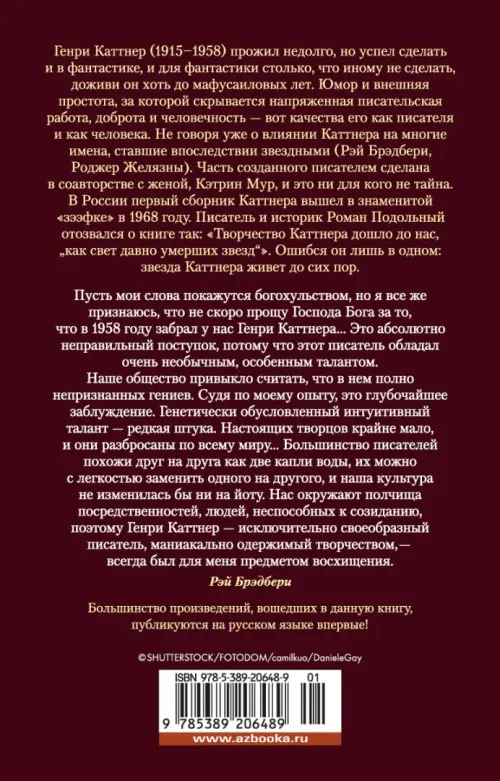 Генри Каттнер, публиковавшийся не только под своей настоящей фамилией, но и под доброй дюжиной псевдонимов, считается одним из четырех или пяти ведущих американских фантастов 1940-х. Легендарные жанровые журналы, такие как "Future", "Thrilling Wonder", "Planet Stories" и "Weird Tales", более чем охотно принимали произведения, написанные им самостоятельно или в соавторстве с женой, известным мастером фантастики и фэнтези Кэтрин Люсиль Мур; бывало, что целый выпуск журнала отводился для творчества Каттнера. Почти все, созданное этим автором, имеет оттенок гениальности, но особенно удавалась ему "малая литературная форма": рассказы о мутантах Хогбенах, о чудаковатом изобретателе Гэллегере и многие другие, сдобренные неподражаемым юмором, нескольким поколениям читателей привили стойкую любовь к фантастике. Почти все произведения, вошедшие в этот сборник, публикуются на русском языке впервые или в новом переводе. Повести "Бог по имени Кру" и "Детский час" удостоены премии "Хьюго".