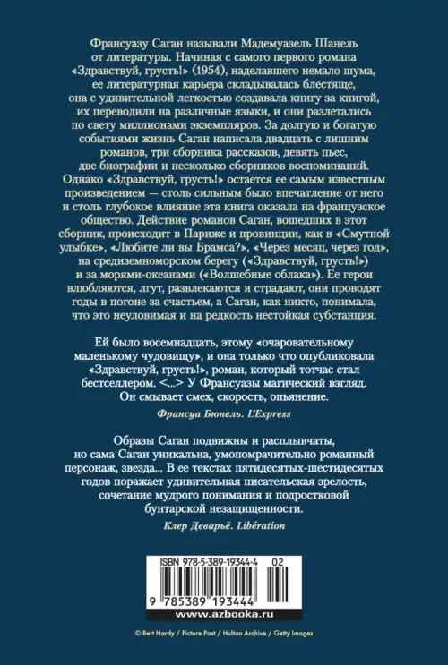 Франсуазу Саган называли Мадемуазель Шанель от литературы. Начиная с самого первого романа "Здравствуй, грусть!" (1954), наделавшего немало шума, ее литературная карьера складывалась блестяще, она с удивительной легкостью создавала книгу за книгой, их переводили на различные языки и они разлетались по свету миллионами экземпляров. За долгую и богатую событиями жизнь Саган написала двадцать с лишним романов, три сборника рассказов, девять пьес, две биографии и несколько сборников воспоминаний. Однако "Здравствуй, грусть!" остается ее самым известным произведением - столь сильным было впечатление от него и столь глубокое влияние эта книга оказала на французское общество. Действие романов Саган, вошедших в этот сборник, происходит в Париже и провинции, как в "Смутной улыбке", "Любите ли вы Брамса?", "Через месяц, через год", на средиземноморском берегу ("Здравствуй, грусть!") и за моря-океанами ("Волшебные облака"). Ее герои влюбляются, лгут, развлекаются и страдают, они проводят годы в погоне за счастьем, а Саган, как никто, понимала, что это неуловимая и на редкость нестойкая субстанция.
