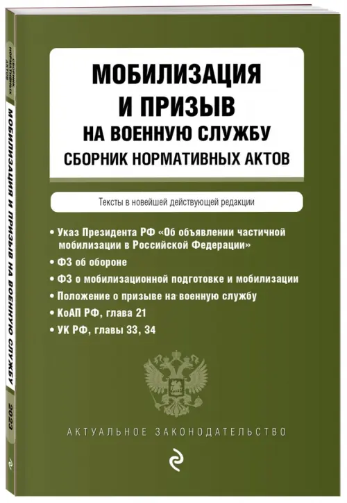 В этом небольшом сборнике - тексты всех основных нормативных правовых актов по вопросам мобилизации и призыва на военную службу в новейшей действующей редакции с изменениями и дополнениями на 2023 год.. Издание содержит тексты: федеральных законов "Об обороне" и "О мобилизационной подготовке и мобилизации", Указа Президента РФ от 21.09.2022 № 647 об объявлении частичной мобилизации, Положения о призыве на военную службу граждан Российской Федерации, а также главы 21 Кодекса РФ об административных правонарушениях, глав 33 и 34 Уголовного кодекса РФ.