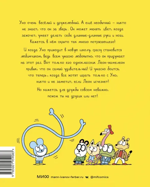 В классе Уно полно разных зверей: медвежонок, мышь, крокодил, хамелеон... И только Уно какой-то странный, ведь он ни на кого не похож. А еще - вытворяет такое! Меняет свой цвет, когда захочет, или вдруг становится счастливым обладателем длинных-длинных рук и ног. Может быть, марсианин? Никто не знает!