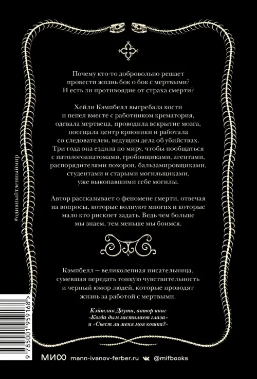 Хэйли Кэмпбелл три года ездила по миру, чтобы пообщаться с людьми, чьи профессии связаны со смертью: с патологоанатомами, гробовщиками, агентами, распорядителями похорон, бальзамировщиками, студентами и старыми могильщиками, уже выкопавшими себе могилы. Она выгребала кости и пепел с работником крематория, одевала мертвеца, проводила вскрытие мозга, посещала центр крионики в Мичигане и работала с детективом по расследованию убийств. Автор рассказывает о феномене смерти, отвечая на волнующие многих вопросы, которые неудобно задавать.