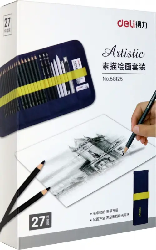 В наборе: карандаши (2H, HB, B, 3B, 5B, 6B, 8B, 9B, 10B, 12B), 2B - 3 штуки, 4B - 3 штуки, угольный карандаш - 3 штуки, ластик-клячка, ластик, держатель для карандашей, нож, бумажные растушевки - 3 штуки.