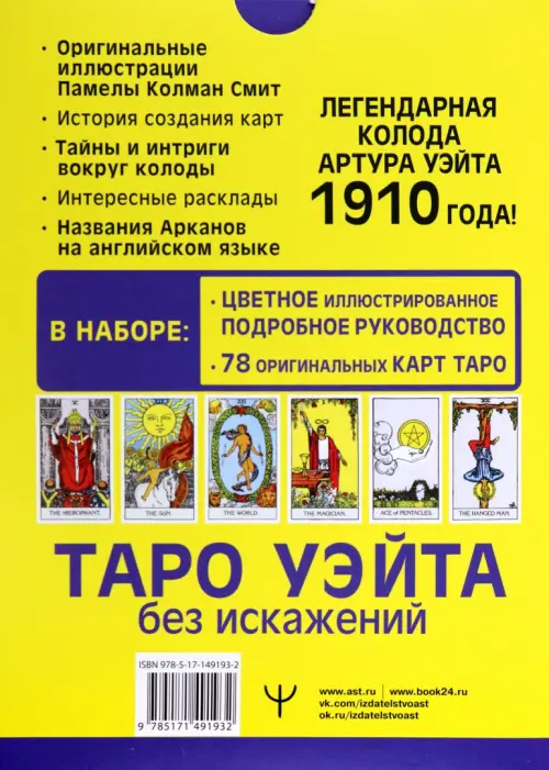 В комплект входят 78 оригинальных карт Таро Уэйта и полноцветная книга-инструкция для гадания в мягком переплете, где вы найдете описание всех Арканов, расклады, а также рекомендации по использованию карт и историю создания оригинальной колоды Уэйта. Все, что нужно, чтобы сразу начать гадать!