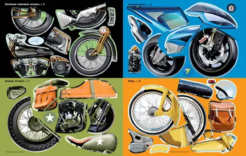 В этой книжке ты найдёшь самые разные мотоциклы – от ретро-мопеда до суперсовременного гоночного байка! Собери и дополни мотоциклы с помощью наклеек.