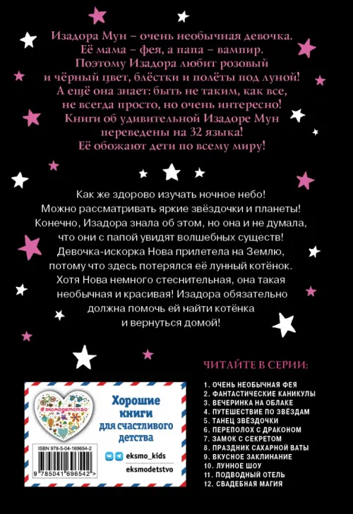 Как же здорово изучать ночное небо! Можно увидеть столько всего интересного! Конечно, Изадора знала об этом, но она и подумать не могла, что, глядя с папой в телескоп, они увидят настоящих гостей из космоса! Девочка Нова прилетела на Землю, потому что здесь потерялся её лунный котёнок. Нова очень необычная и немного стеснительная. Изадора обязательно должна помочь ей найти котёнка и показать, что смущаться совсем не стоит!