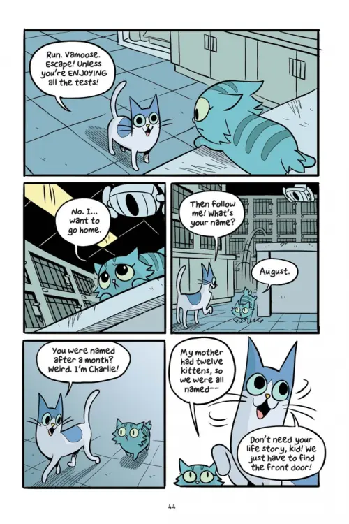 August is a brilliant inventor who is afraid of the outside. Charlie is a crack pilot who isn't afraid of anything. Together these pals save lives every day. They also happen to be cats who pilot a powerful, mechanical dog suit! Always eager to leap into danger, this feline duo have their work cut out for them as they try to thwart Princess, an evil alien bent on enslaving mankind. Don't let the fact that Princess looks like a cute, diaper-wearing baby fool you. She's clever, determined, and totally ruthless. So when Princess and the browbeaten fools she calls servants enact a brilliant and dastardly plan to conquer Earth, August and Charlie pull out all the stops to save the day.