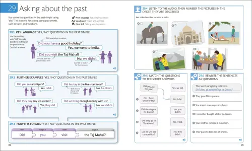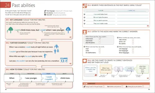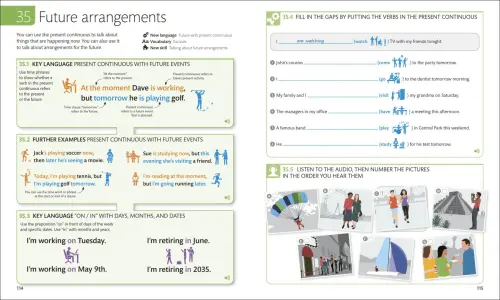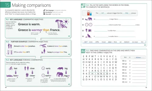 - Sample language examples: New language topics are introduced in context using clear, illustrated, and colour coded explanations