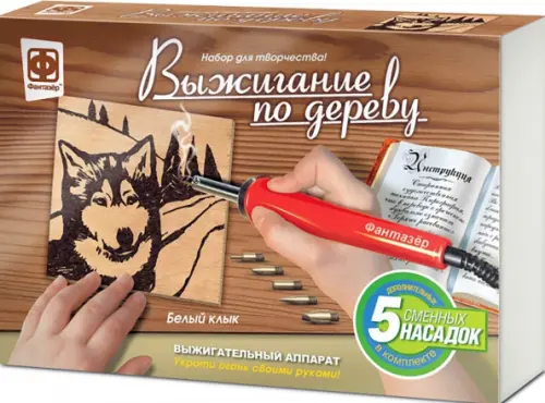 Теперь не нужно думать, как сделать линии более тонкими, где найти подходящий материал для будущей картины - все в этой коробке, Во-первых, это удобный современный выжигательный аппарат с 6 сменными насадками, чтобы вам было легче сотворить именно то, что вы задумали. Во-вторых, это два листа фанеры: один с уже нанесенным сюжетом будущего рисунка, а второй - чистый.
