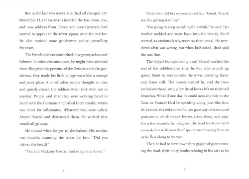 Marcel loves riding his bicycle, whether he's racing through the streets of his small town in France or making bread deliveries for his parents' bakery. He dreams of someday competing in the Tour de France, the greatest bicycle race. But ever since Germany's occupation of France began two years ago, in 1940, the race has been canceled. Now there are soldiers everywhere, interrupting Marcel's rides with checkpoints and questioning.