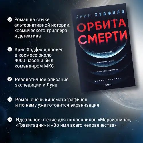 ""Орбита смерти" - захватывающий детективный технотриллер, написанный человеком, который сам бывал в космосе и прекрасно разбирается в деталях этой деятельности. Если вам скучно читать мемуары, но вы хотите узнать больше о космонавтике полувековой давности, то книга Хэдфилда - для вас. Главное, помнить, что это всё-таки фантастика!" - Антон Первушин