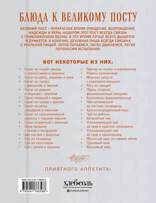 Великий пост для всех — это особенное время. Даже для не ходящих в храм. Хочется каким-то образом приобщиться к культуре наших предков, частью которой являются и великопостные дни. Если вы нуждаетесь в особенных блюдах для этих дней, самое время открыть эту книгу. В ней собраны основные блюда каждодневной трапезы: салаты, закуски, супы, овощные и крупяные блюда, квасы и чаи. Собрала их Галина Поскребышева, известный в советское время автор, пропагандирующий и тогда русскую православную кухню.