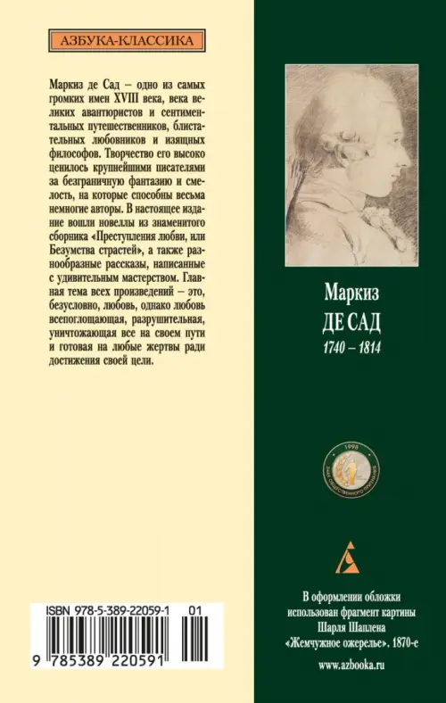 Маркиз де Сад — одно из самых громких имен XVIII века, века великих авантюристов и сентиментальных путешественников, блистательных любовников и изящных философов. Творчество его высоко ценилось крупнейшими писателями за безграничную фантазию и смелость, на которые способны весьма немногие авторы. В настоящее издание вошли новеллы из знаменитого сборника «Преступления любви, или Безумства страстей», а также разнообразные рассказы, написанные с удивительным мастерством. Главная тема всех произведений — это, безусловно, любовь, однако любовь всепоглощающая, разрушительная, уничтожающая все на своем пути и готовая на любые жертвы ради достижения своей цели.