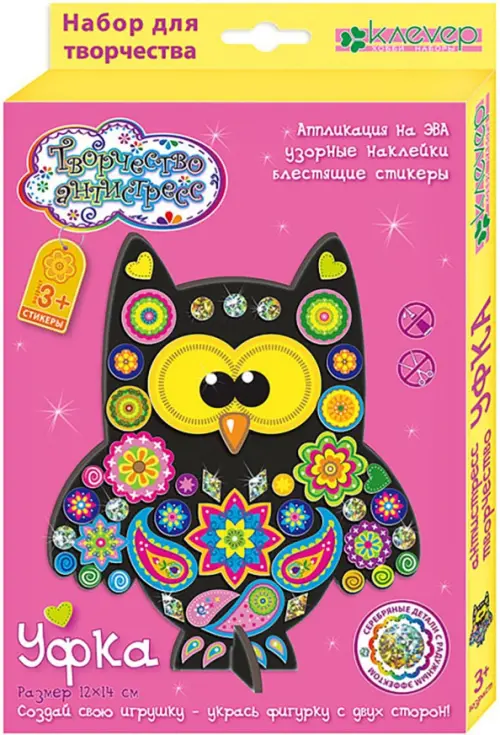 Набор "Уфка" из серии сказочных фигурок откроет волшебство техники "Творчество-анстистресс": дети от 3-х лет познакомятся с мягким матовым материалом ЭВА, наклеят красивые узорные и голографические наклейки на силуэт, создавая свой неповторимый образ совы. В наборе 2 комплекта стикеров и фигурка с подставкой, - фигурку можно украсить с двух сторон и укрепить на подставке, - созданная своими руками фигурка может быть игрушкой, украшением или подарком друзьям.