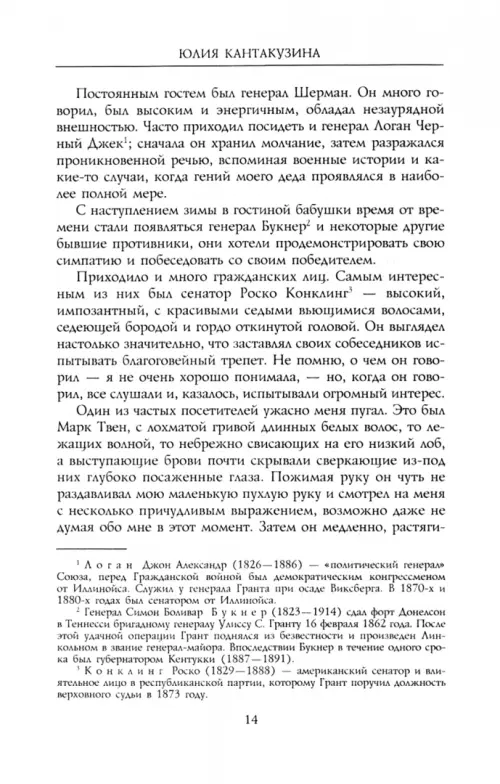 Внучка героя Гражданской войны в США, легендарного генерала Улисса Гранта, дочь генерал-майора Фредерика Гранта, Юлия вышла замуж за потомка знаменитого рода византийских императоров Михаила Кантакузина. Даже самые тяжелые революционные дни и выпавшие на ее долю испытания княгиня встречала с присущей ей деятельной энергией. Внимательный взгляд Юлии зафиксировал важные, но никем ранее не отмеченные черты меняющегося облика страны, которую она успела полюбить. В начале 1918 года после множества приключений княгине с мужем удалось выбраться из России.