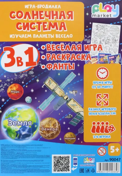Комплектация: игровое поле формата А2 (42х59,4 см), кубик, 4 фишки, раскраска (на обороте вкладыша), фанты с веселыми заданиями.