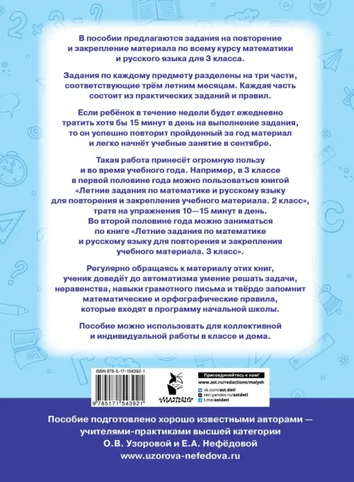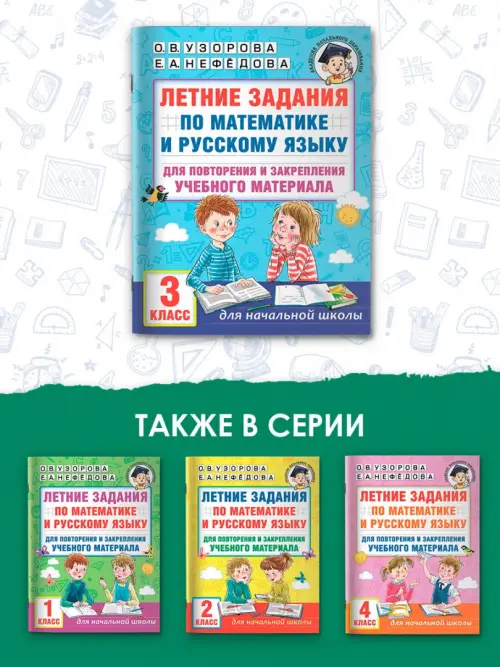 Переходим в 3 классЕсли вы обнаружили ошибку в описании товара «Летние задания по математике и русскому языку для повторения и закрепления материала. 3 класс» (авторы: Нефёдова Елена Алексеевна, Узорова Ольга Васильевна), то выделите её мышкой и нажмите Ctrl+Enter. Спасибо, что помогаете нам стать лучше!