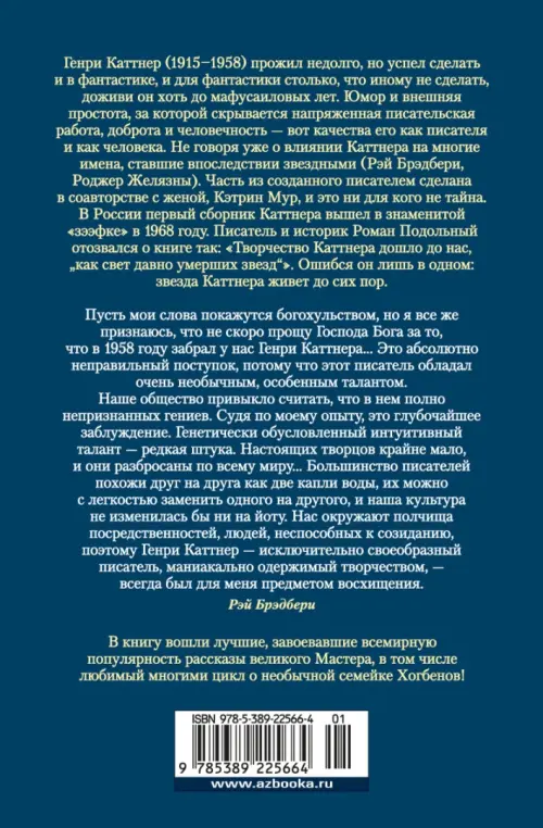Генри Каттнер, публиковавшийся не только под своей настоящей фамилией, но и под доброй дюжиной псевдонимов, считается одним из четырех или пяти ведущих американских фантастов 1940-х. Легендарные жанровые журналы, такие как "Future", "Thrilling Wonder", "Planet Stories" и "Weird Tales", более чем охотно принимали произведения, написанные им самостоятельно или в соавторстве с женой, известным мастером фантастики и фэнтези Кэтрин Люсиль Мур; бывало, что целый выпуск журнала отводился для творчества Каттнера. Почти все, созданное этим автором, имеет оттенок гениальности, но особенно удавалась ему "малая литературная форма": рассказы о мутантах Хогбенах, о чудаковатом изобретателе Гэллегере и многие другие, сдобренные неподражаемым юмором, нескольким поколениям читателей привили стойкую любовь к фантастике. Повесть "Ночная схватка", награжденная ретроспективной премией "Хьюго", является приквеллом к знаменитому роману "Ярость". Этой же премии удостоены рассказы "Ветка обломилась, полетела колыбель", "То, что вам нужно", "Некуда отступать". В книгу вошли лучшие, завоевавшие всемирную популярность рассказы великого Мастера, в том числе любимый многими цикл о необычной семейке Хогбенов!