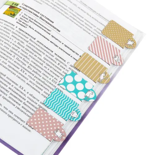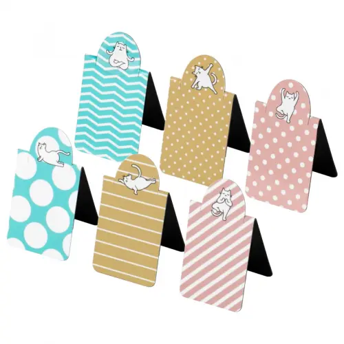 Закладки выполнены из картона и винила, надежно крепятся на листе благодаря магнитной полосе. Позволяют быстро найти нужную страницу. Удобны в применении и даже спустя большое количество времени будут выглядеть аккуратно. Размер закладки — 35х25 мм. В наборе 6 штук.