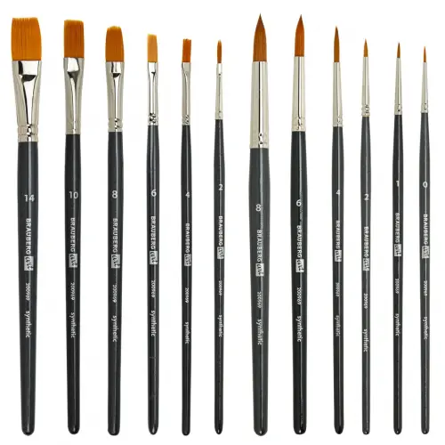 Кисти изготовлены с применением синтетики. Отличаются универсальностью в использовании, обусловленной упругостью ворса и прекрасными впитывающими свойствами пучка. Короткая ручка из древесины покрыта лаком, что защищает ее от воздействия красок и влаги. Форма пучка — круглая № 0, 1, 2, 4, 6, 8; плоская № 2, 4, 6, 8, 10, 14. Номер кисти соответствует реальной ширине пучка в миллиметрах. Упаковка — скрутка из полиэстера.
