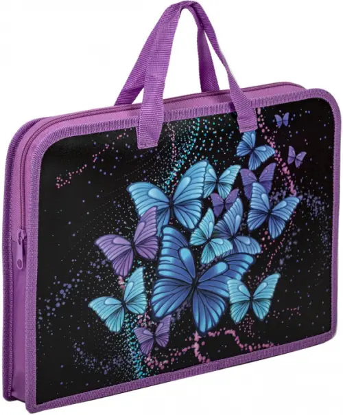 Папка на молнии с ручками формата А4 выполнена из пластика, по краям имеет тканевую окантовку. Одно отделение. Ручки-тесьма. Застежка-молния расположена по верхнему краю папки. Цветная печать.