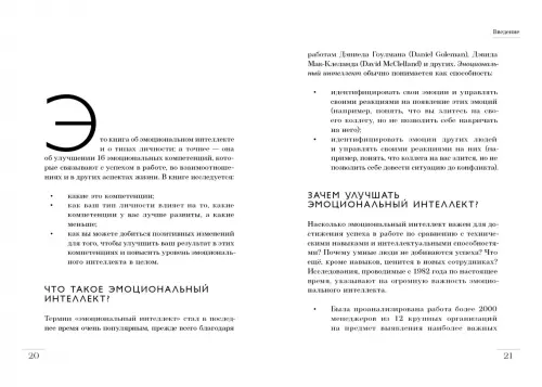 Предлагаемая книга - об эмоциональном интеллекте и о типах личности, а точнее - она об улучшении 16 эмоциональных компетенций, которые связывают с успехом в работе, в взаимоотношениях и в других аспектах жизни. В книге исследуются эти компетенции, а также влияние типа личности на развитость у людей тех или иных компетенций и то, как можно добиться позитивных изменений, улучшающих результаты в этих компетенциях и повышающих уровень эмоционального интеллекта в целом.