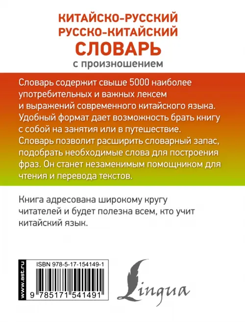В словаре представлено свыше 5000 наиболее употребительных и важных лексем и выражений современного китайского языка. Все слова в обеих частях снабжены официальной китайской транскрипцией на латинской основе ханьюй пиньинь, что позволит запомнить не только правильное произношение, но и верный рисунок тонов. Авторы также разработали кириллическую транскрипцию, которая облегчит вхождение в язык начинающим, еще не вполне освоившим ханьюй пиньинь, и ввели ее в китайско-русском словаре наравне с официальной китайской транскрипцией. Подробная инструкция в начале и краткий справочник по тонам позволят легко ориентироваться в словаре.