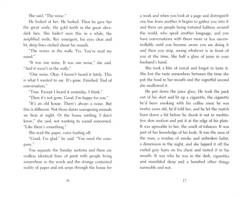 As Lauren, the body artist of the title, becomes strangely detached from herself and the temporal world, the novel becomes an exploration of a highly abnormal grieving process; a fascinating expose of 'who we are when we are not rehearsing who we are'; and a rarefied study of trauma and creativity, absence and presence, isolation and communion.