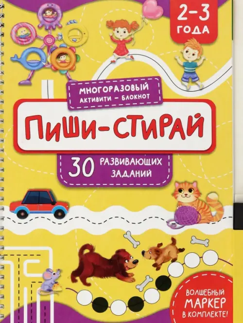 Многоразовая развивающая рабочая тетрадь пиши и стирай для детей 2-3. В этом учебно-методическом пособии 30 страниц, 48 увлекательных заданий для малыша 2 - 3 лет, которые направлены на всестороннее развитие детей. В игровой форме ребенок познает математику, окружающий мир, развивает творческие навыки. Рабочая тетрадь пиши стирай с маркером подойдет как первое пособие для детей от 2 лет.